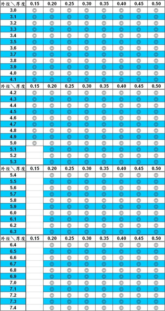 外徑3.0mm起~7.4mm, 管厚0.15mm起~0.5mm, 可代切斷加工0.5mm起,